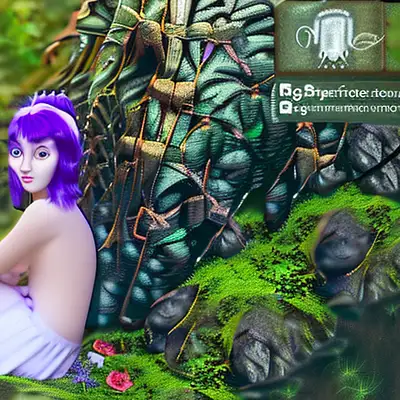 Generate an image of a beautiful woodland fairy with purple hair, wearing a skirt made of flowers and a tight satin blouse. The fairy is seated on a moss-covered stone with crossed legs and bare feet, one of which gently touches the surface of a small stream. The fairy gazes sweetly towards the camera, smiling seductively. The image should exude a magical and enchanted atmosphere, with lighting reminiscent of the typical 'golden hour. ' It must be extremely detailed, rich in details, in ultra-high 8k resolution, and in a fantasy style.