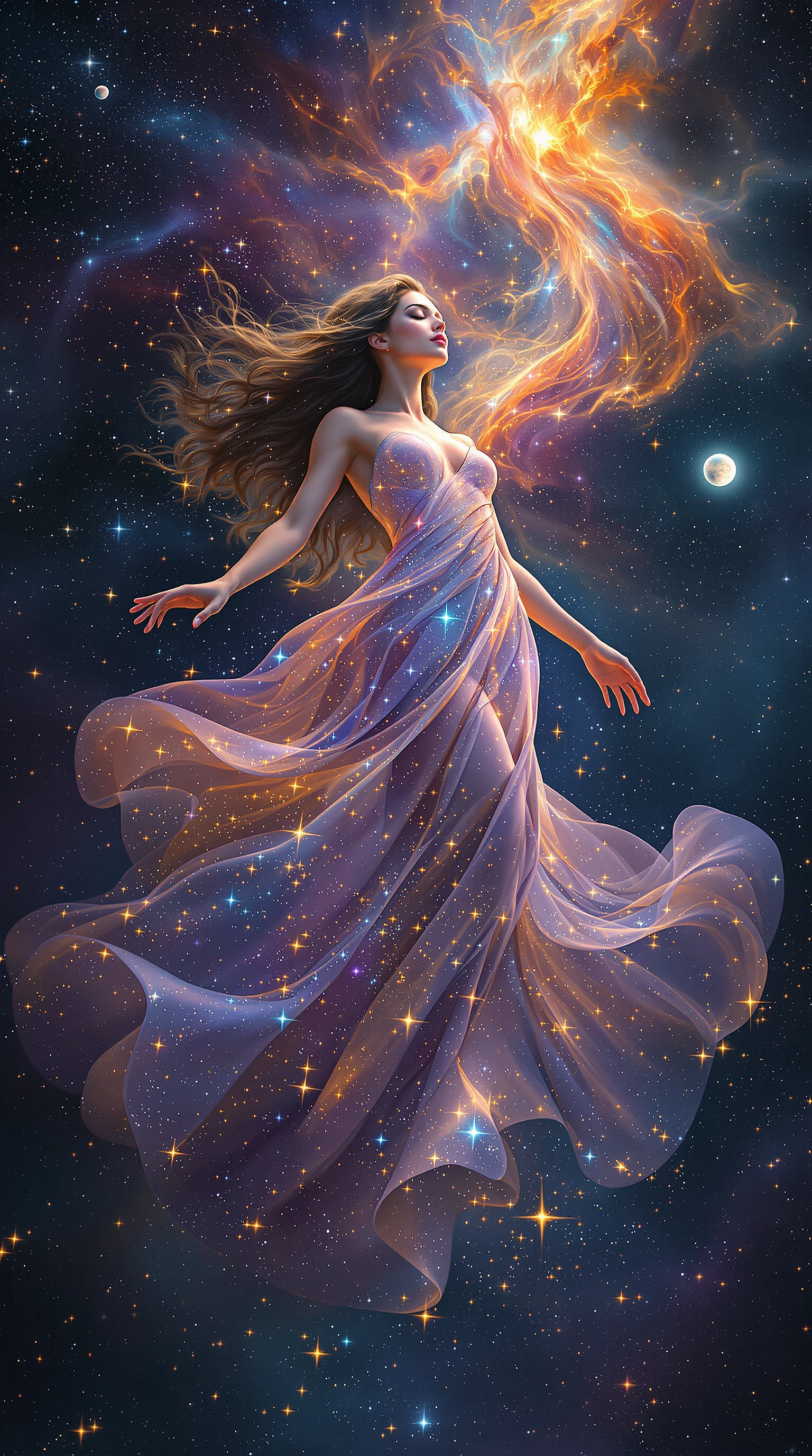 An **ultra-high definition, hyper-detailed** depiction of a **celestial goddess floating gracefully** in the heart of a **vibrant cosmic nebula**.