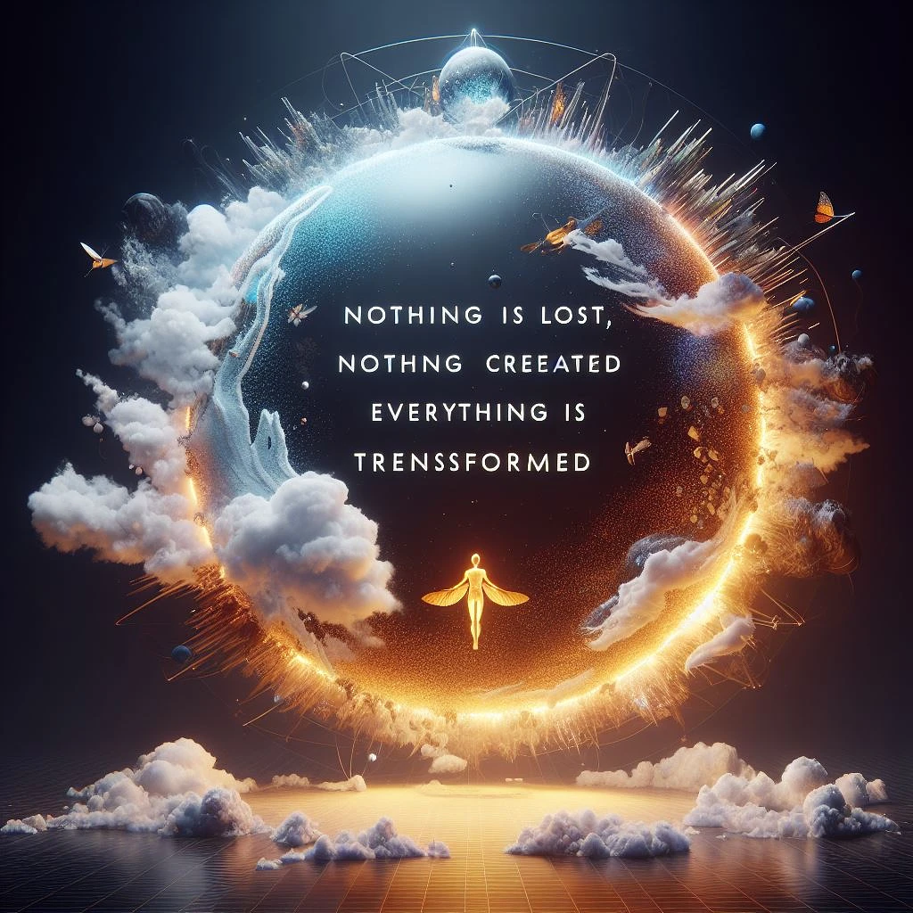 Construct a visually captivating representation of the concept 'Nothing is lost, nothing is created, everything is transformed. ' Leverage Octane Render in Unreal Engine 5 for an 8K masterpiece. Utilize transformative lighting, dynamic typography, and a scene that symbolizes continuous change. Let the visual convey the profound message of perpetual transformation and interconnectedness