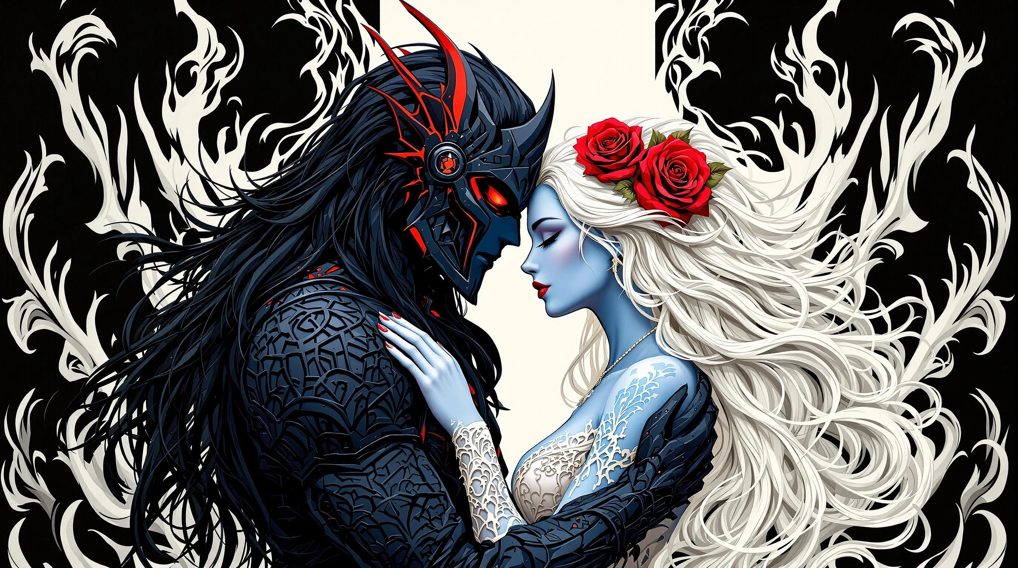a stylized minimalistic ebony and ivory hollow outline sculpture featuring two fantasy characters in an embrace. The semi-realistic style is highly detailed and vibrant, with a focus on contrast and dynamic poses. The male character on the left has dark, armored skin with intricate patterns and a menacing helmet with red accents, obscuring his facial features. His skin is a deep blue-black, and he has long, flowing black hair. The female character on the right has pale blue skin and long, white hair adorned with a red rose. Her attire is elegant, with swirling patterns that mirror the male character's armor. The background features a stark white vertical stripe flanked by swirling black flames, that blends into the null void of emptiness behind them adding a dramatic and mystical atmosphere to the composition.