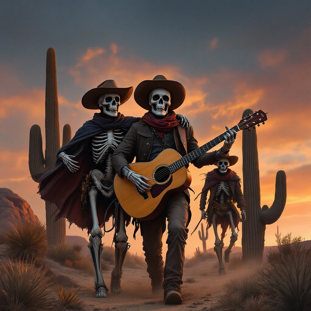 Hola, quiero la siguiente imagen: Un hombre junto a dos calaveras caminando de espaldas en el desierto. La calavera de la derecha lleva una guitarra y los tres se agarran por los hombros. Quiero que la escena sea al atardecer y que sea jovial, que parezca que, mientras andan, están bailando. Estaría bien, ya que están en el desierto y al atardecer, que aparecieran cactus. Quiero que el estilo sea tipo western
