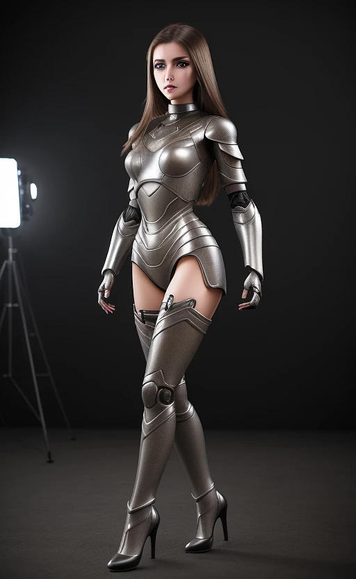 Pretty, brunette, young, girl, smokey eyes, cybernettic armor, heels, facing viewer, ultra realistic, smooth skin, good make up.