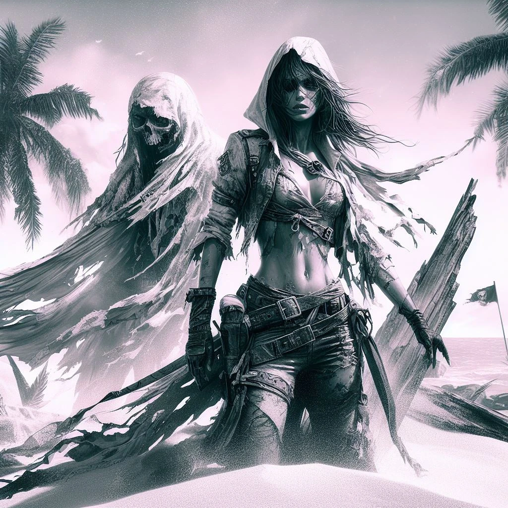 best quality, ultimate detailed, digital art illustration, a female badass pirate abandoned, lost alone on tropical desert island background, shredded fabrics, breathtaking beauty, key visual, vibrant colors, comprehensive cinematic, volumetric lightning