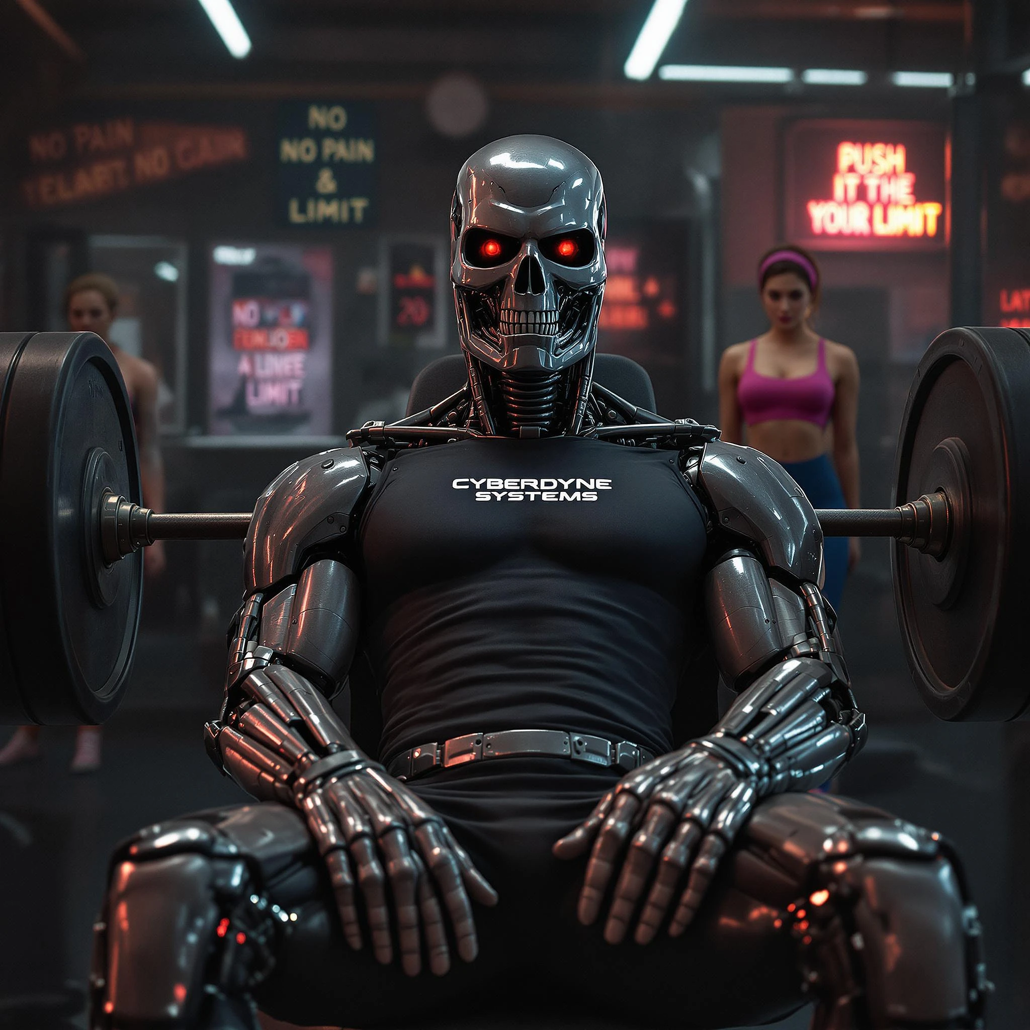 A hyperrealistic 1980s-style cinematic scene showing the Terminator from The Terminator movie seated on a bench press machine during a pause between sets in a classic 80s-style gym. He is wearing a retro, tight-fitting muscle shirt with the Cyberdyne Systems logo prominently displayed on the chest. The shirt clings to his powerful frame, with every muscle beneath the fabric well-defined and emphasized, exuding a sense of raw strength and precision. Paired with this, he wears classic 80s-style athletic shorts and high-top sneakers, completing his iconic look. The Terminator's hands rest purposefully on his thighs, palms relaxed yet strong. His hands are large, with detailed, visible knuckles and veins running across his forearms and the backs of his hands. Each hand has five fingers, with their joints flexed in a natural and anatomical way that reveals both human-like dexterity and advanced engineering beneath the skin. The metal beneath his skin subtly shines through, particularly on the knuckles and along the joints, where the connection between skin and the robotic endoskeleton becomes more apparent. His fingers have the precise structure of a skilled combatant—thick, muscular, and strong, with the sharp, angular appearance expected from his advanced endoskeleton design. The fingertips and nails are clean, adding an unsettling organic touch to their otherwise mechanical perfection. The transition from skin to exposed endoskeleton has a smooth, polished, and seamless appearance, without jagged or clunky edges, emphasizing the advanced technological design of the Cyberdyne Systems model. The bench press barbell is loaded with four 20 kg weight plates on each side, emphasizing a heavy lifting session. The gym itself exudes a classic 80s vibe, with retro equipment, motivational posters, and neon signs. All visible signage in the background exclusively displays the following motivational phrases: 'No Pain, No Gain, ' 'Bodybuilding & Fitness, ' and 'Push It to the Limit. ' ONLY In the background, Sarah Connor, played by Linda Hamilton, is elegantly performing yoga in a classic 80s-inspired workout outfit. She is wearing high-waisted spandex leggings and a brightly colored, form-fitting crop top, paired with leg warmers and classic retro headbands. Her pose is strong and graceful, embodying the perfect mix of strength, discipline, and style as she executes a yoga stretch with focus and determination. The soft glow of ambient neon light illuminates her figure, highlighting her fitness and commanding presence. The atmosphere is gritty yet cinematic, with ambient neon lights illuminating the scene. Volumetric lighting cuts through the misty air, casting dramatic, sharp beams that highlight the Terminator's powerful figure, metallic features, and Sarah Connor's graceful yoga practice. Every detail is rendered in stunning hyperrealism—the texture of the muscle shirt, the elegant transition between skin and metal, the precise alignment of the weight plates, the dynamic folds of Sarah Connor's 80s workout outfit, and the neon glow reflecting off polished gym equipment. The scene captures the nostalgic spirit of 1980s action cinema, immersing the viewer in a retro-futuristic masterpiece that showcases the Terminator's intensity, focus, and determination, as well as Sarah Connor's strength, resilience, and iconic 80s aesthetic.