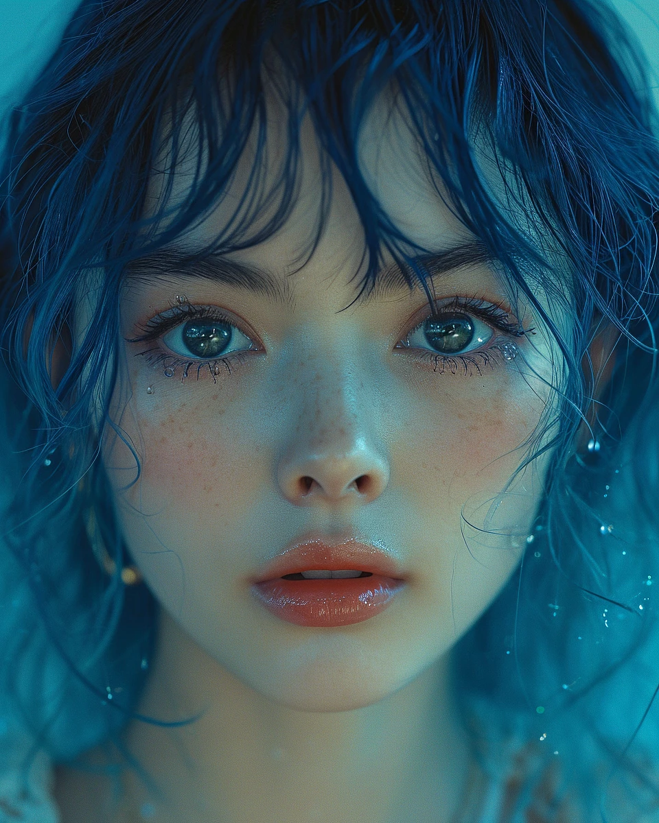 japanese model, in the style of rinko kawauchi, light indigo and dark blue, xiaofei yue, relatable personality, pegi nicol macleod, 85 new wave, fairy academia --ar 71:89 --stylize 750 --v 6