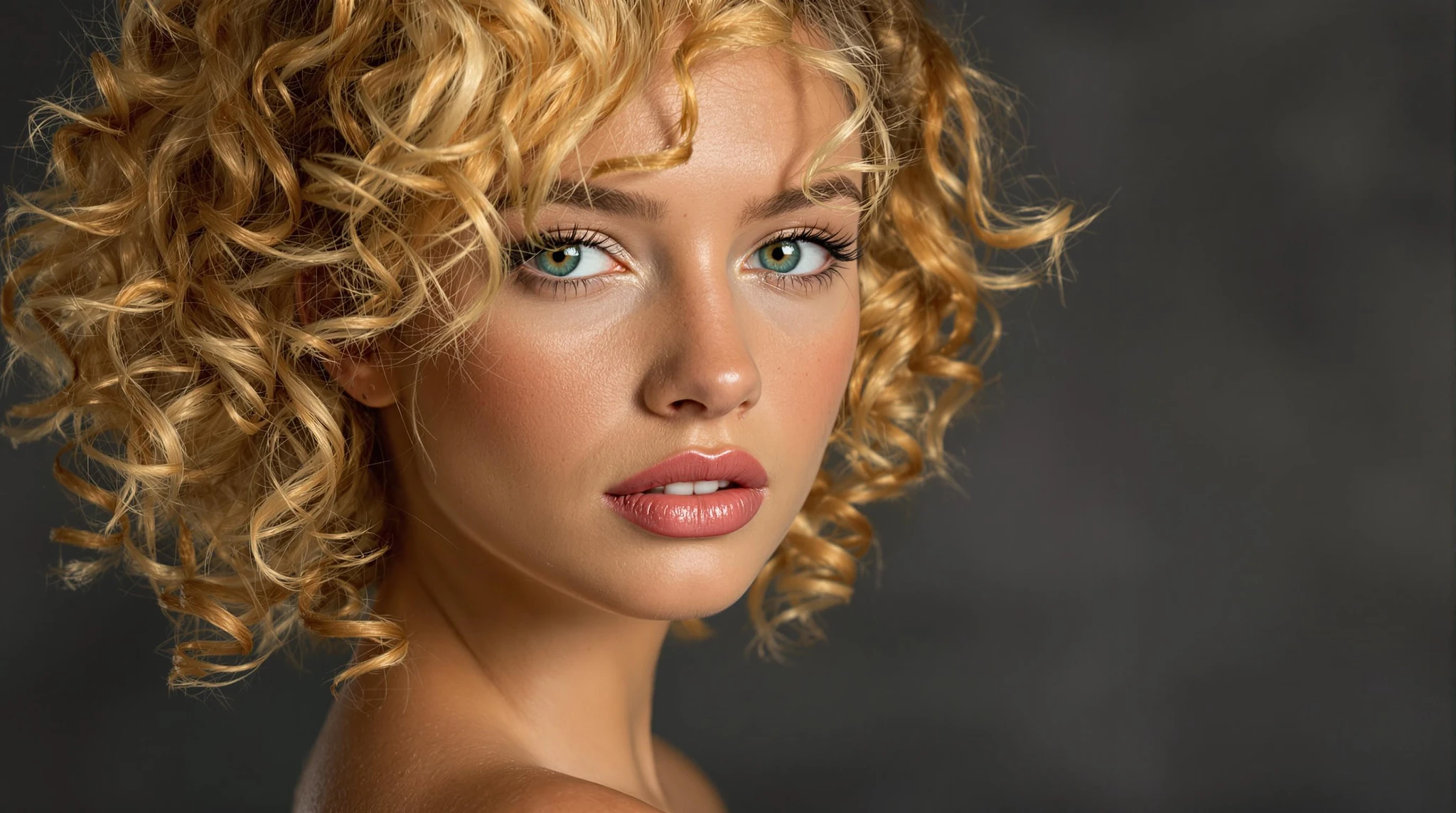 "Image is a portrait captured with a Sony A1 50. 1mb using a 26mm prime lens, featuring a 21 year old model with striking curly, voluminous, tousled hair in a vibrant shade of Bronde ombré. The model has fair skin and piercing emerald green eyes, plump lips with a direct gaze towards the camera. The lighting is warm, casting soft shadows that enhance the texture of the hair and the contours of the face. The background is charcoal grey and blurred, creating a bokeh effect that draws attention to the subject. The overall composition is centred, with the subject's face occupying the majority of the frame, emphasising the details and colours. "