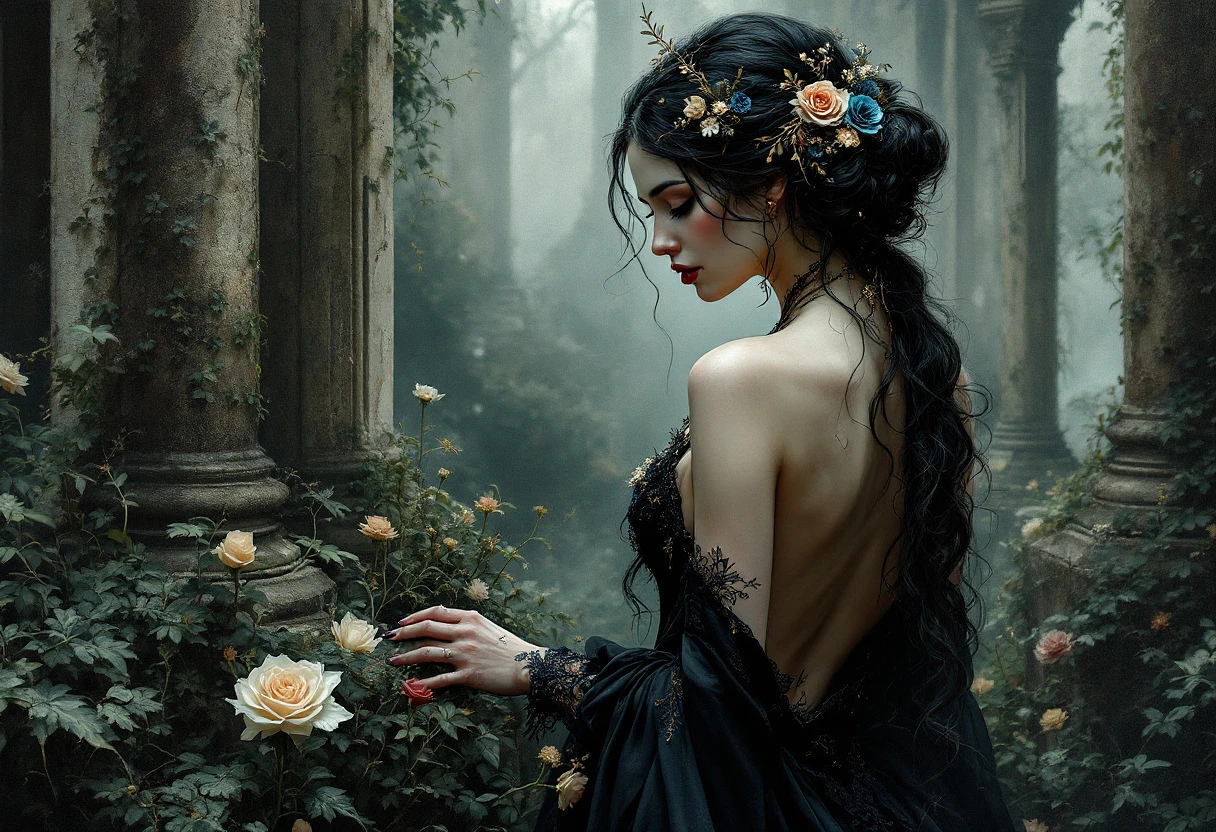 ultra-detailed oil painting:1. 3, impasto:1. 2, high relief texture:1. 2, hyper realistic style:1. 3, female:1. 5 with delicate pale skin, graceful posture, back partially turned, head slightly bowed, long black wavy hair:1. 3 in an intricate updo adorned with delicate flowers (deep blue:1.2, cream:1.2, muted red:1.1) , golden filigree woven through her hair, ornate floral embroidery and golden threads flowing over her bare back and shoulders, wearing a flowing dark gown with subtle gothic lace, standing amidst an overgrown, crumbling garden with ivy-covered ruins, mist swirling around ancient stones, soft ethereal light casting gentle shadows, cinematic composition, rich painterly brush strokes, melancholic and mysterious mood, gothic romanticism, inspired by Edgar Allan Poe’s The Fall of the House of Usher, masterpiece, 8K ultra HD.