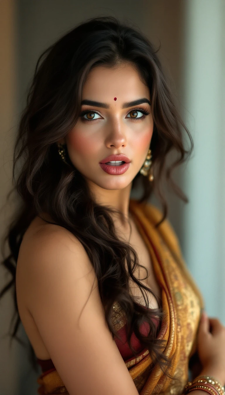 Jennifer Connelly, biting lip, 18-21 years old, brown hair, Indian hair style, saree, trying to removing the bra, inhaled chest, wide open eyes, A plus curvy shaped body structure, wearing bangles on hand, bindi, high-quality photo portrait, shot on an iphone camera, double eyelid --ar 34:65 --style raw