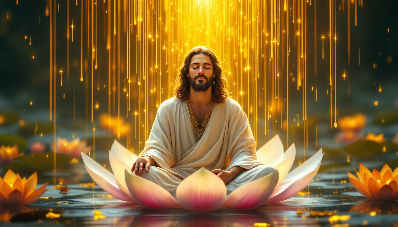Prompt jesus in a serenity state meditating calmly in lotus flower. . receiving golden rain from milky way. static charachter only moving golden rain is falling down