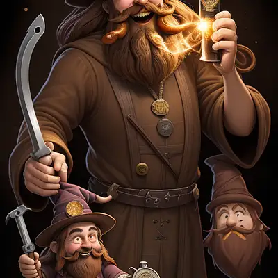 studio trigger style, realistic anime, face-on, high quality, solo focus, dramatic lighting, dieselpunk wizard, mountain man beard, auto mechanic, magic spell, glowing neon wrench, grease, technomagic, junkyard, wizard hat, embroidered robe