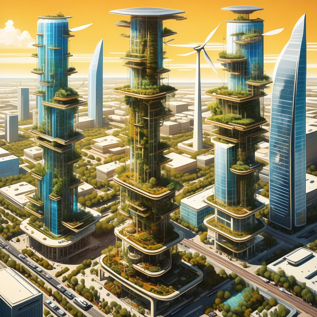 Immerse yourself in a solarpunk cityscape envisioned by Robert Emerson Clampett, where towering vertical gardens thrive. The golden sunlight filters through solar panels, casting a warm glow on the ecologically sustainable city. Detailed wind turbines dot the landscape, capturing the energy of the wind, while flying taxis and drones glide through the sky, adding a sense of dynamism. Electric cars smoothly navigate the city highway, seamlessly interacting with driverless vehicles. The city's futuristic background showcases the integration of Maglev trains and Hyperloop, symbolizing efficient transportation systems. As a smart city, the seamless connectivity and sustainable practices are seamlessly integrated. Shot with a Nikon D850 camera and an f1. 6 lens, the hyper-realistic image captures the richness of colors, lifelike textures, and dramatic lighting, bringing this solarpunk utopia to life. The Cinestill 800 film stock photograph adds depth and vibrancy, making the scene truly captivating.