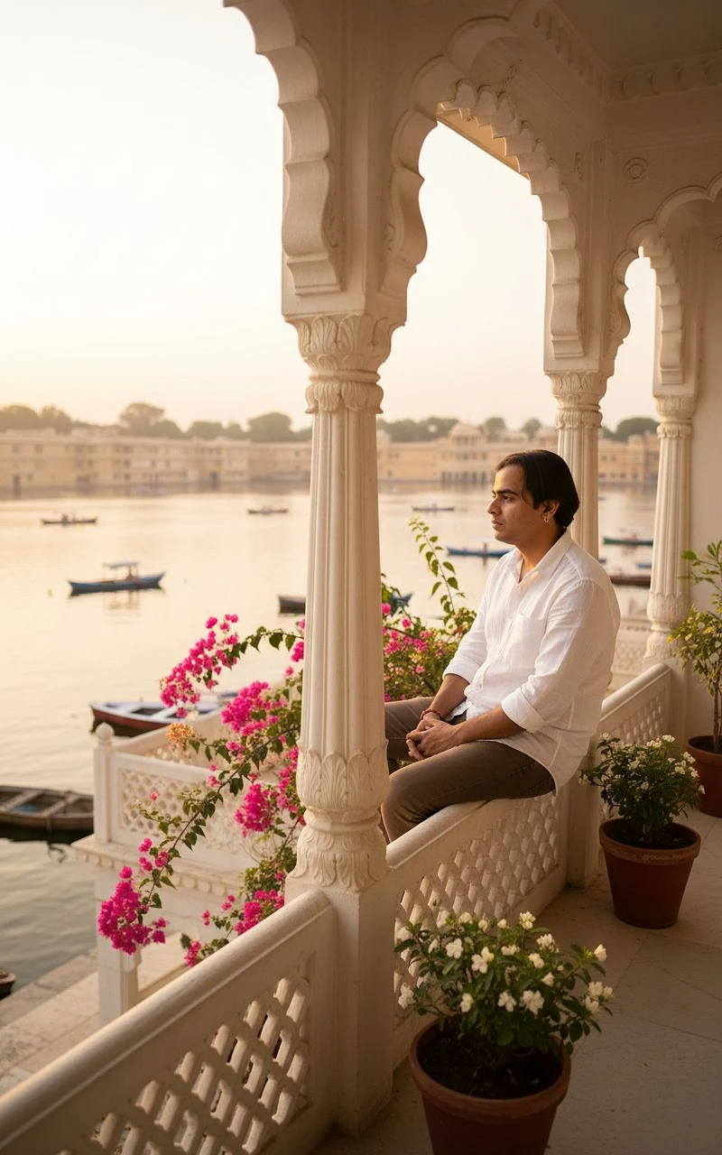 Create a photo of a serene and elegant a stylish young man. his hair are same as reference, He wears one small, silver hoop earring in each ear, adding a subtle yet refined touch of individuality and style. sitting on a traditional white marble balcony overlooking a calm lake at sunset. The architecture features intricate Indian arches and ornate columns, painted in soft white tones. he wears awhite linen shirt sleeves roll up with a browns jeans, he gazes thoughtfully toward the horizon. The balcony is adorned with vibrant flowering vines of pink bougainvillea and potted white blooms, adding a delicate natural charm to the scene. In the background, boats float gently on the water, and golden-hued buildings reflect the warm evening light across the lake.