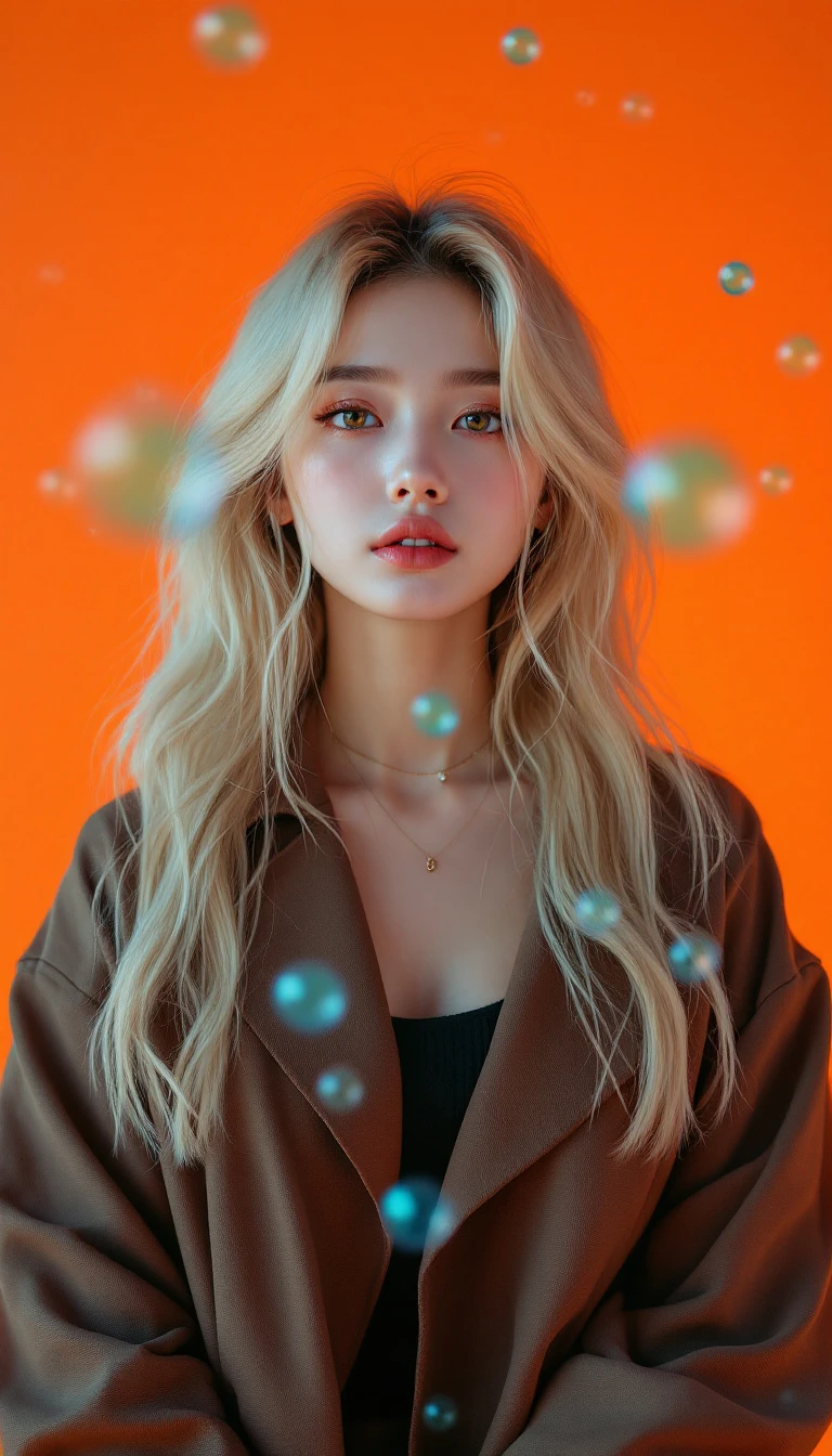 photography, orange tone, a blonde Korean model with beautiful eyes, with piercing gaze, full body in fashionable clothes, solid orange background, with and small bluish bubbles, floating, using a camera setup that imitates a wide aperture, f/ 1. 4 --ar 9:16 --style raw