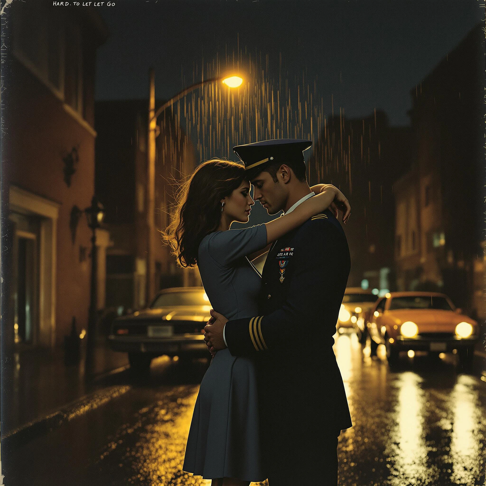 a cinematic, emotionally charged 1970s soul album cover scene, a young woman in a blue dress embraces her lover in a formal United States Air Force dress blues uniform, standing closely on a quiet rain-soaked street at night, their foreheads gently touching in a tearful farewell, vintage cars parked behind them, warm golden streetlight glowing above, reflections shimmering on wet pavement, wind slightly lifting her hair and coat, dramatic soft lighting, muted earthy color palette with blue and amber accents, photorealistic detail, retro film grain texture, emotional storytelling moment, inspired by 70s soul vinyl cover photography, 1:1 format, timeless and unforgettable, subtle handwritten text in soft cursive: "Uncommerce – Hard to Let Go", placed gently in a corner with low opacity, 逼真