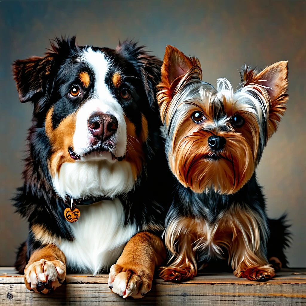 Create a highly detailed photograph of a Bernese Mountain Dog and a short haired Yorkshire terrier recreating the portrait from the movie stepbrothers. one sitting behind the other with his paw on the others shoulders.