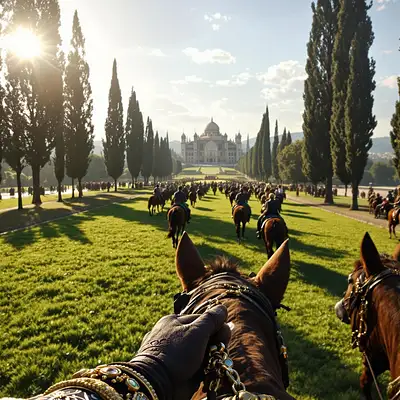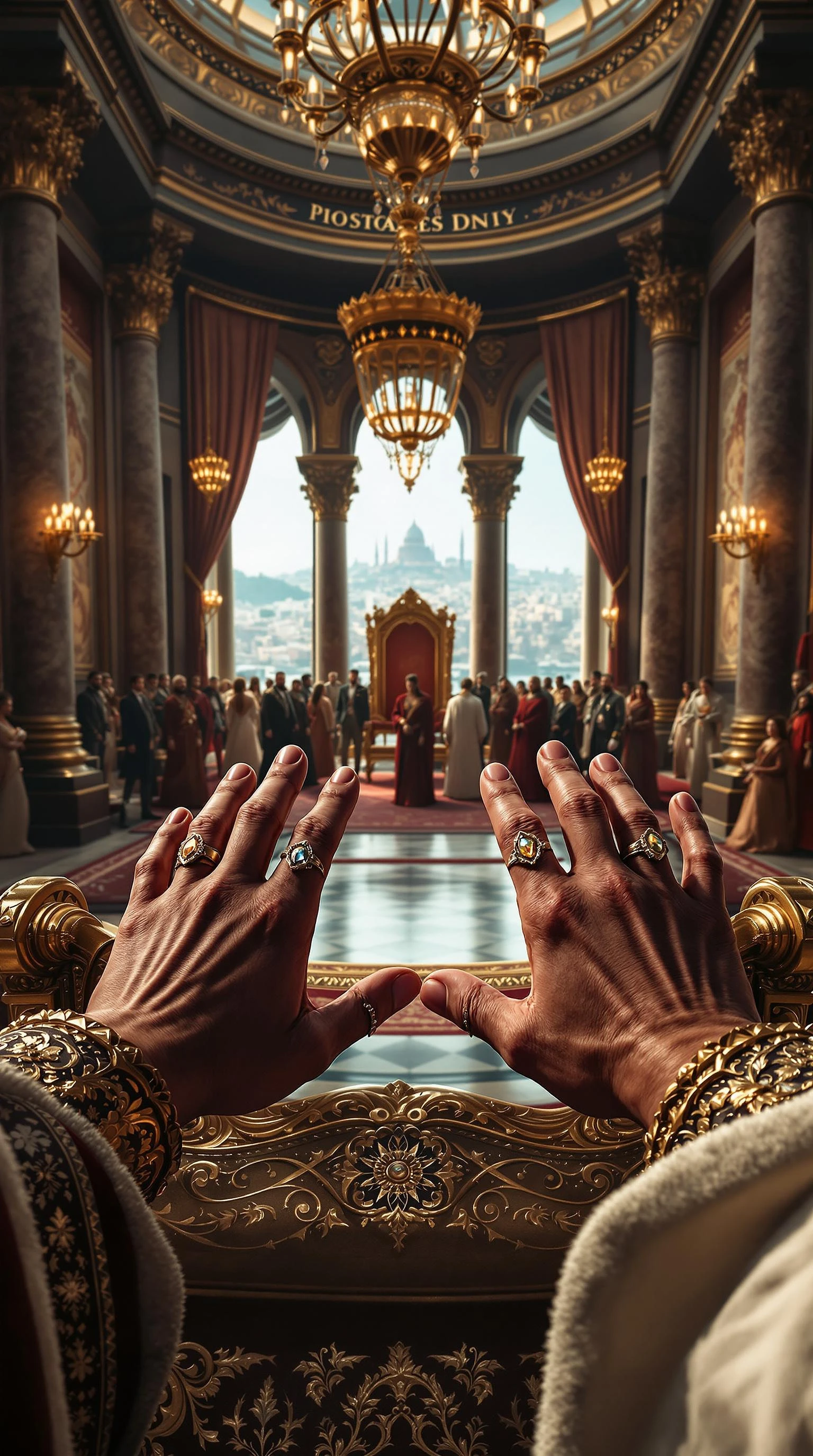First person POV, the Sultan’s hands rest on the ornate golden armrests of the imperial throne, adorned with detailed Ottoman rings. The camera angle focuses solely on the Sultan’s hands as they grip the armrests, fingers visible with the glint of gemstone rings. The grand, dimly lit divan room stretches out before him, with high marble pillars, intricate Ottoman tile work, and hanging tapestries depicting the empire’s history. The sound of murmured conversations and the rustling of parchment fills the air as various viziers, advisors, and generals stand in front of the throne, discussing affairs of the state. The Sultan’s fingers tap lightly on the armrest, a silent command for attention. Through the wide windows, the skyline of Istanbul can be seen, bathed in the soft glow of daylight. The golden chandeliers above cast soft light on the marble floor and the detailed embroidery on the Sultan's velvet robe, but the focus is solely on the Sultan’s hands, poised with the power to decide the fate of the empire. --ar 9:16 --s 250