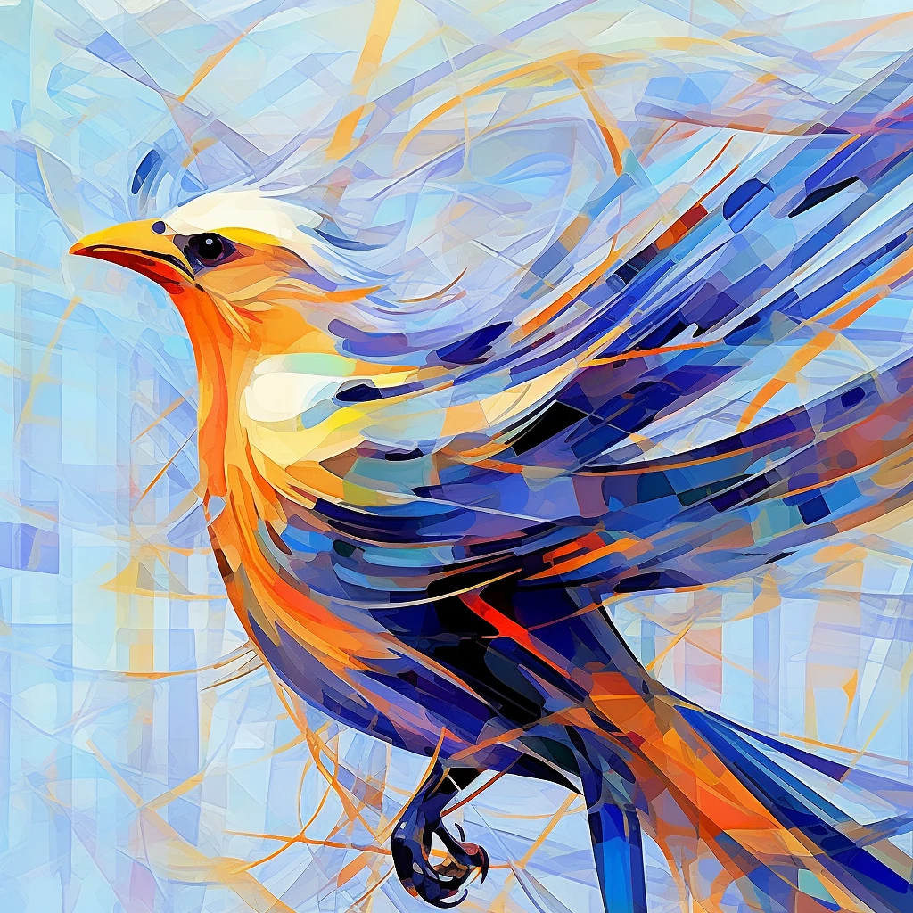 Abstract illustration of a bird, attending an art exhibition, creating chaos, HD, by Marie Severin, X-ray, vector, weirdcore, abstract background --v 5. 1 --style raw