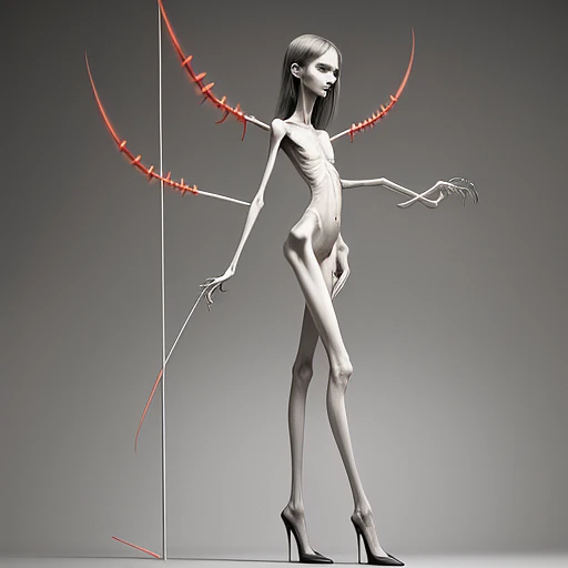 a needle-thin anorexic girl with skinny long legs and long skinny calves in high heels with long hooked claws, naked
