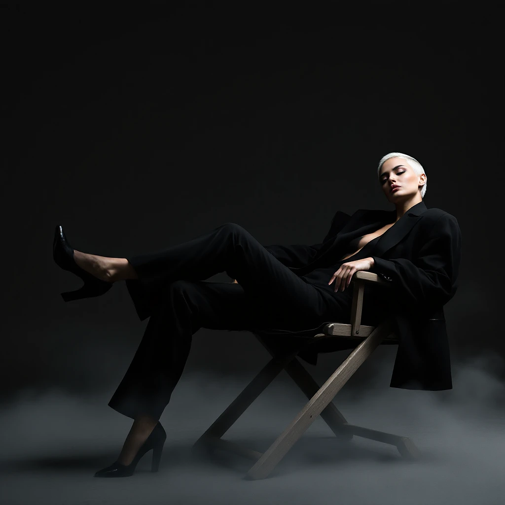create an image of a young tall slender woman with white buzz hair, captured in a striking and contemporary photo-shoot within a minimalist setting, lounging in an director wood chair. She is elegantly dressed only in a black blazer and trousers, her posture relaxed yet filled with intention, leans back comfortably, her long legs casually draped over the side of the chair, her arms resting loosely along the top, and her head tilted slightly back, giving a sense of ease and confidence, background is a plain, dark fog, highlighting the stark contrast between the chair's rigid structure and her soft, fluid pose, lighting is soft and diffused, casting gentle shadows that sculpt her features and the textures of her attire