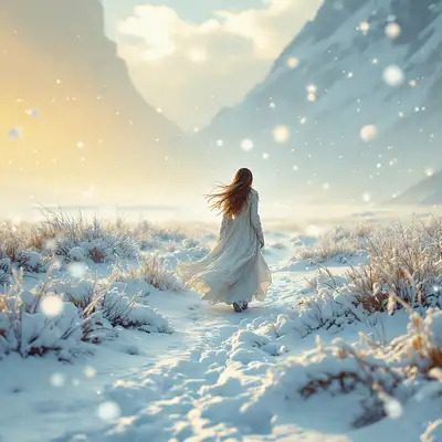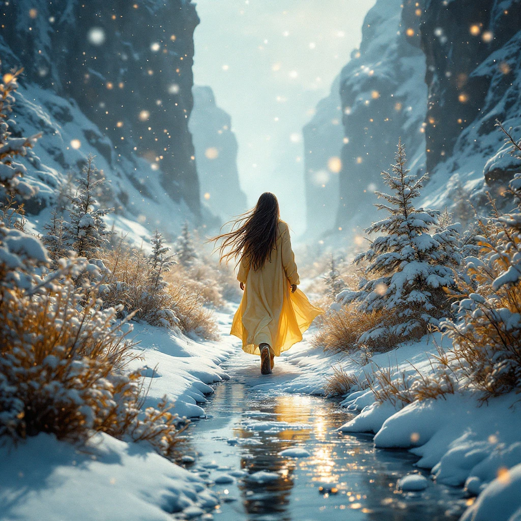 a woman with long hair walking through a frozen landscape with snow fall, in the style of cinematic montages, dragon art, franciszek starowieyski, yellow and white, john howe, hyper-realistic details, himalayan art