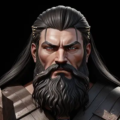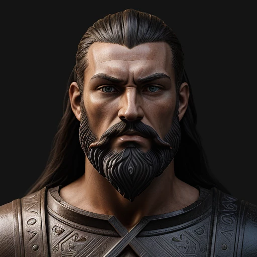 stoic masculine sculpture in color, black background, image taken from the front, face, very muscular, long straight hair, hyper realistic, 4k –v 5. 2 –s 250, with viking features, more robust, with a beard, portrait from the front, with different poses
