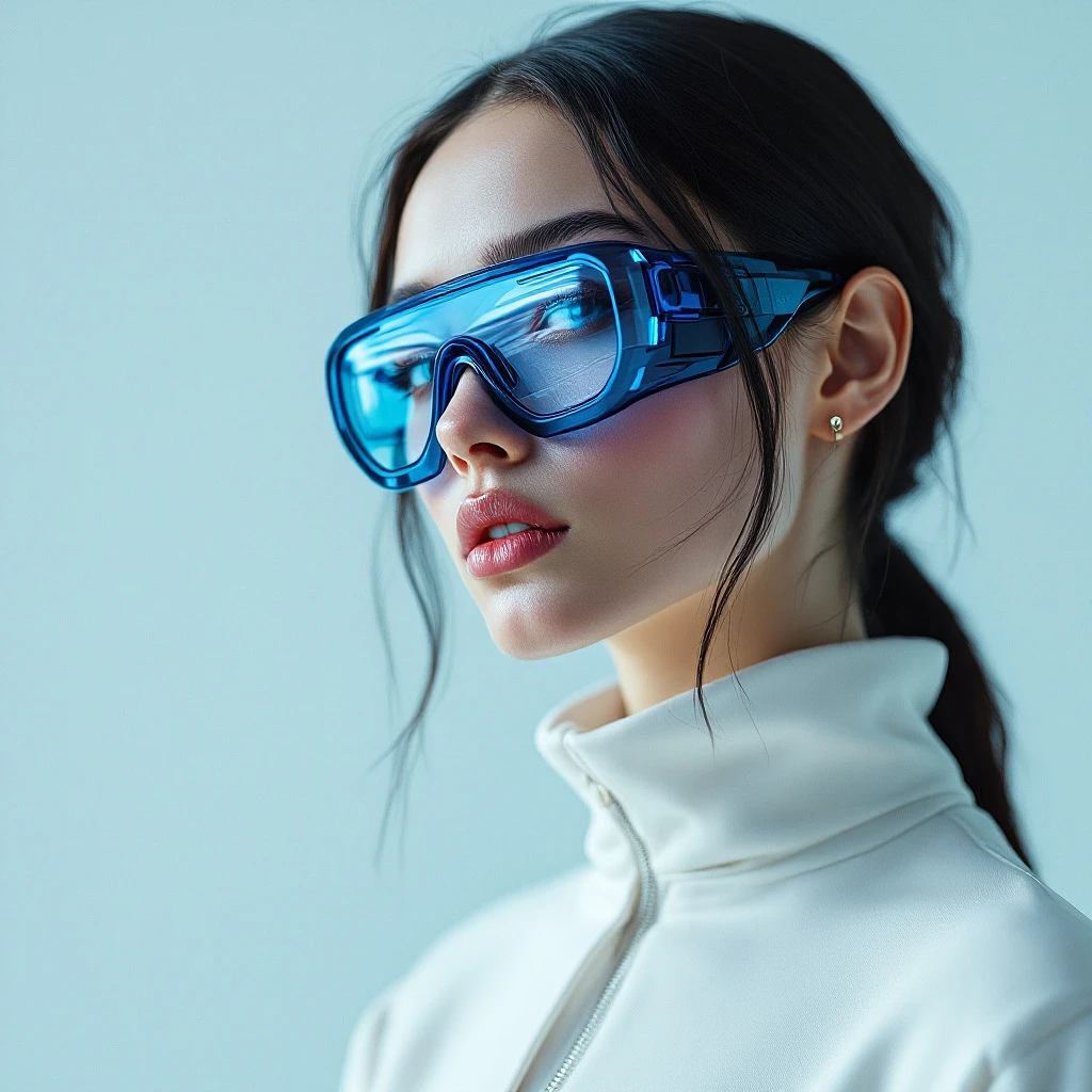 professional studio advertising, professional No arguments futuristic girl fullbody Fashion shoot, Jacquemus and Moncler collaboration: dark blue translucent futuristic sungles, hyper-realistic, detailed 8k, realistic --s 750 --chaos 50 --ar 74:63 - Pan Left (fast)