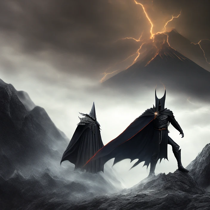 full body, Lord of the ring Sauron, cape in the wind of a storm, dark, night, volcano, mountain, epic, dramatic, hyper - realistic 3d game character, action intensity pose --ar 16:9 --style raw