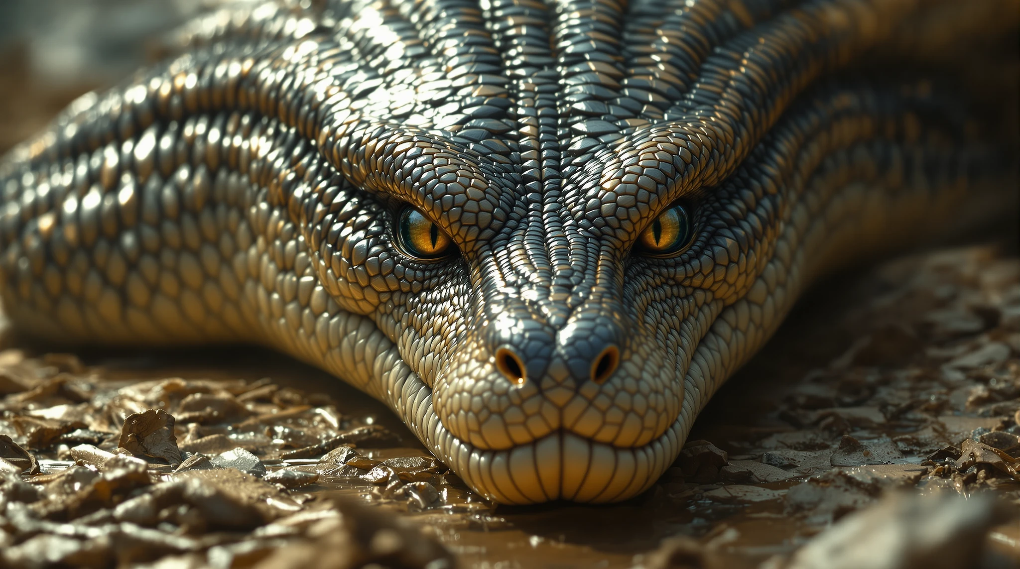 A ultrawide, hyper-detailed movie still of a hybrid creature combining the majestic features of an anaconda and an African woman