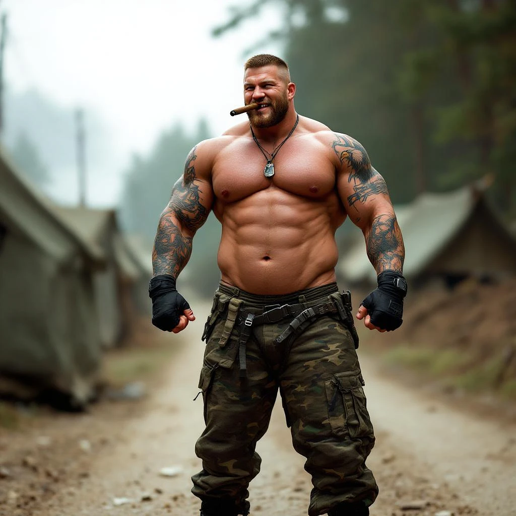 Chris Redfield, Full body image, looking at us, shirtless, muscular abs, lots of tattoos, eagle chest tattoo, dog tags, big cigar in mouth, black fingerless gloves, big long penis bulge in camouflage thong underwear, big feet in black combat boots, standing on dirt road with army green tents, flexing one bicep, grinning