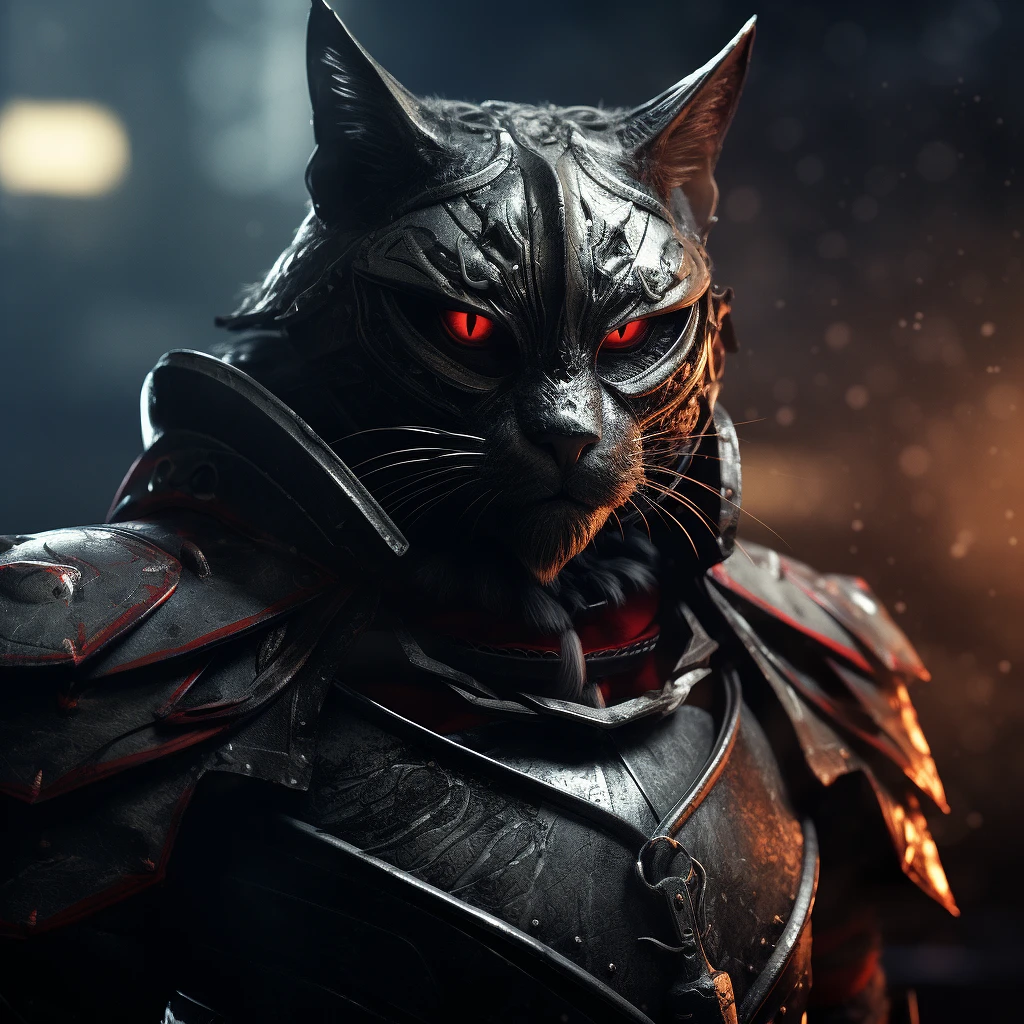 Black battle-cat in armor, red eyes, long fangs, cinematic, growl, dark background, 4k