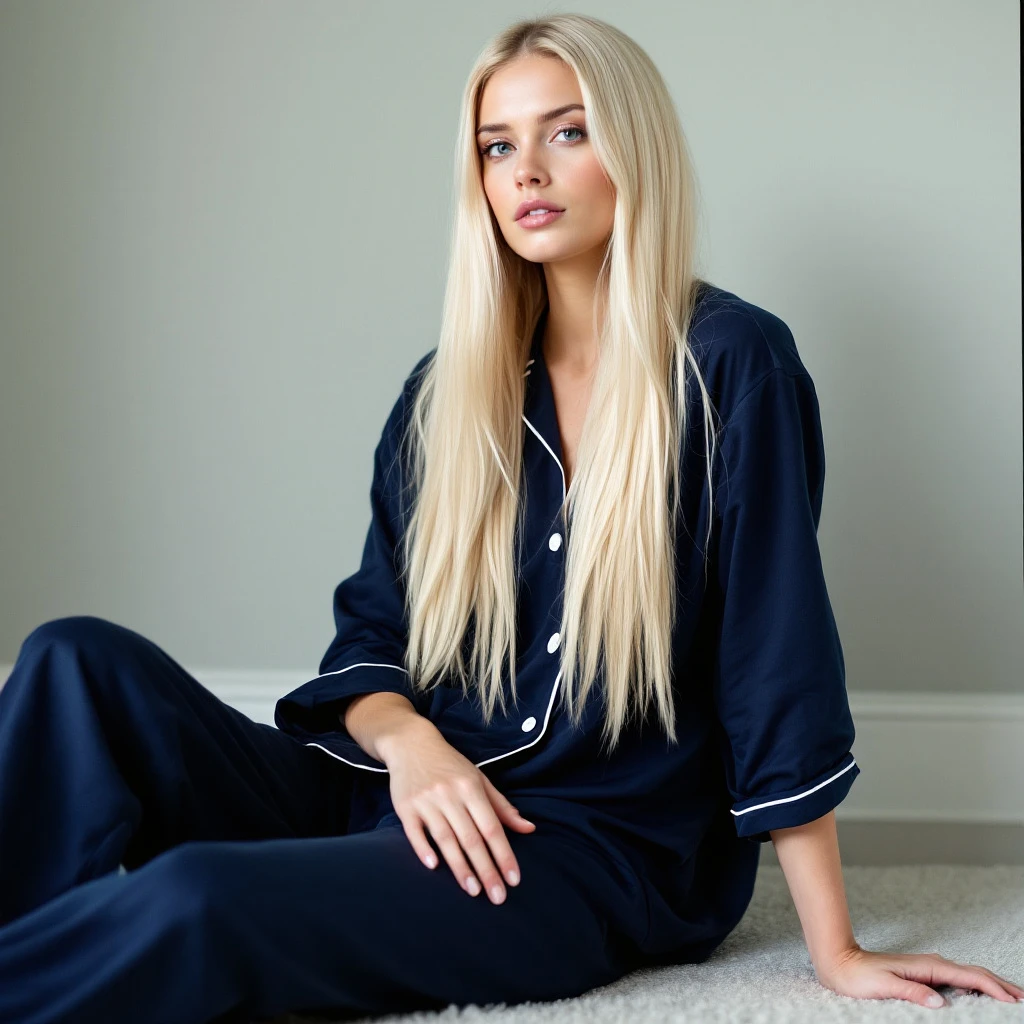 A female, with long straight blonde hair in a dark blue pajama set, partially unbuttoned, sits on the floor. Her left leg is bent, and her right leg extended. Her left arm rests on her left knee, and her right hand is on the floor for support. She gazes directly at the camera with a neutral expression in a plain indoor setting.