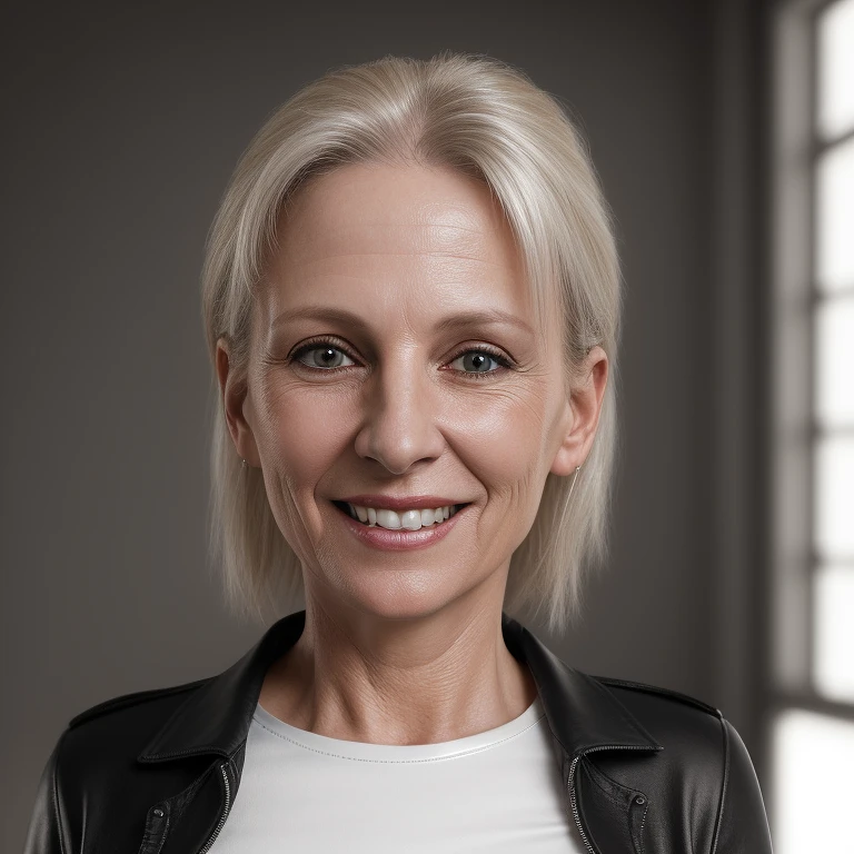 hyper realistic headshot photo of a 45 year old white woman, black leather shirt, skinny, looking into the camera, smiling slightly, ultrarealistic, soft lighting, 8k
