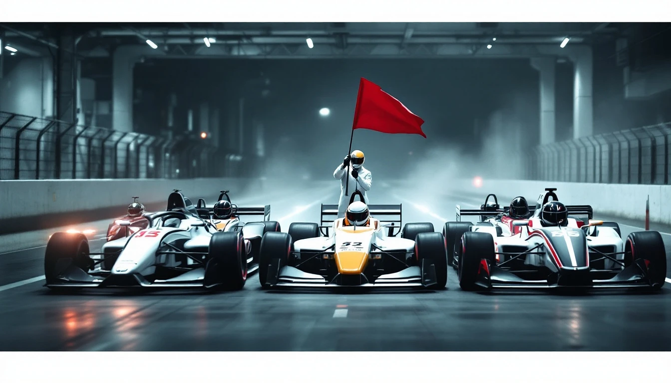 At the starting line there are 5 racing cars - cars with different club logos. The camera looks from behind and slightly above the racing cars, with drivers wearing helmets sitting in them. On the side of the road behind the track in front of the cars, a man in a white coaching uniform blows a whistle and waves a red flag. Style - cyberpunk