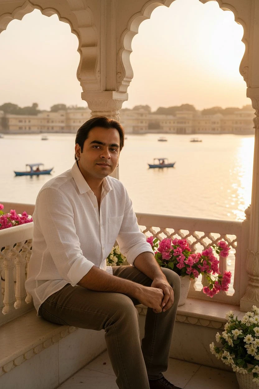 Create a photo of a serene and elegant a stylish young man. his black hair are same as reference, He wears one very small, silver hoop earring in each ear, adding a subtle yet refined touch of individuality and style. sitting on a traditional white marble balcony looking a camera , behind calm lake at sunset. The architecture features intricate Indian arches and ornate columns, painted in soft white tones. he wears awhite linen shirt sleeves roll up with a browns jeans, he gazes thoughtfully toward the horizon. The balcony is adorned with vibrant flowering vines of pink bougainvillea and potted white blooms, adding a delicate natural charm to the scene. In the background, boats float gently on the water, and golden-hued buildings reflect the warm evening light across the lake.
