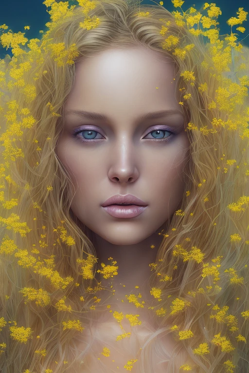 portrait of a beautiful blond woman, standing in field full of iridescent flowers, detailed stunning face, full body, confident pose, confident, yellow dress, female, woman, god iridescent colored rays, intricate, elegant, seductive, realistic, hyper realistic, character design, concept art, highly detailed, illustration, digital art, digital painting, depth of field, headroom
