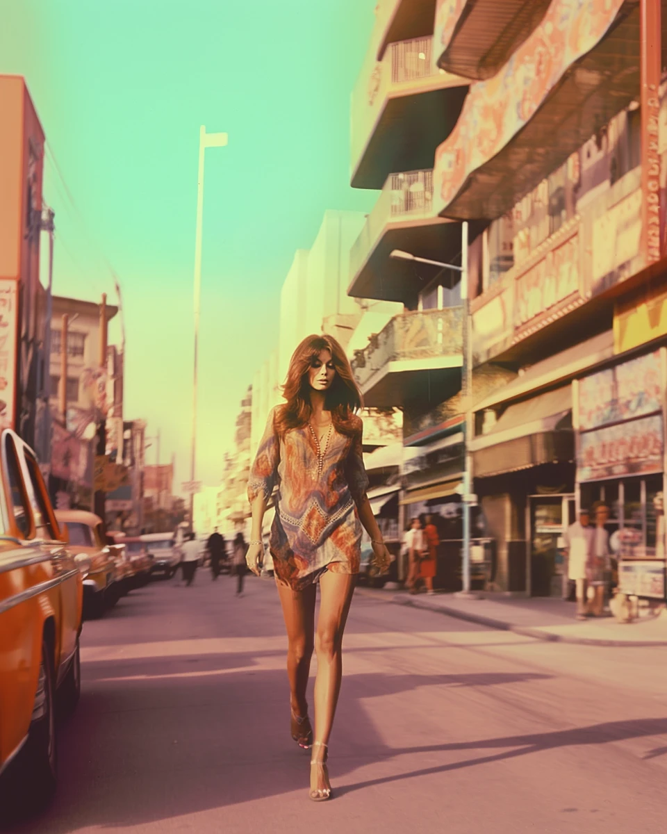 psychedelic photo of young raquel welch walking on the street of 1967 Los Angeles, raquel welch is positioned according to golden ratio in the relation to the picture measures, sunset, vintage colors, highly detailed, superb quality, photo realistic, shot on Leica camera, 56mm, fine film grain --weird 10 --chaos 5 --v 5. 1 --ar 4:5