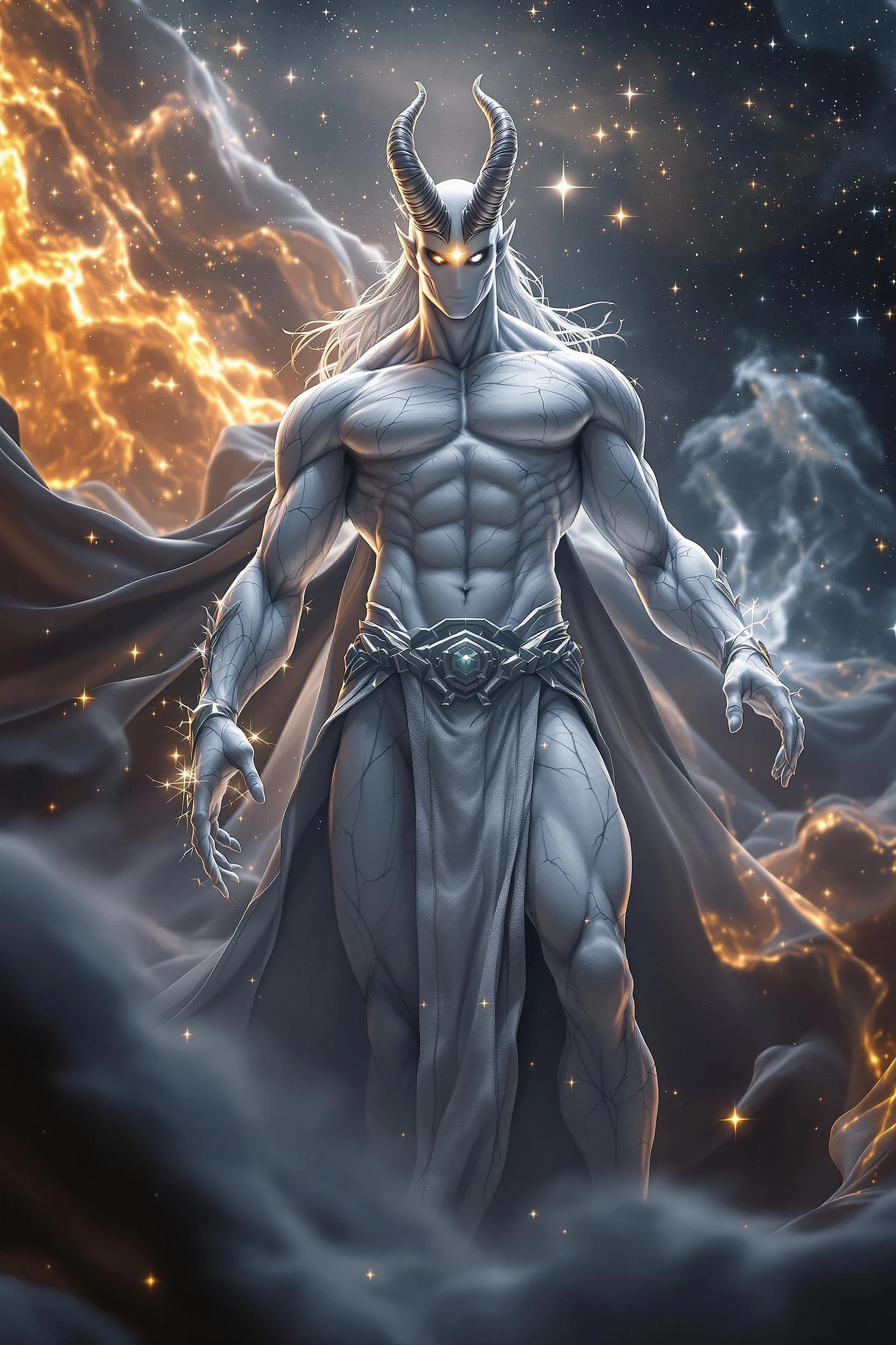 God of Gods, full-body, No Hair or mouth, Marble Skin, Etherial, muscular, one Glowing Golden eye and one Glowing White Eye, epic, cinematic, 8k, hyper detailed, Ultra detailed, Commanding Gods of the Universe, standing powerfully in a outer space with the fabric of space and time being pulled, small pair of Silver horns, photorealistic, unreal engine, octane render, sharp image