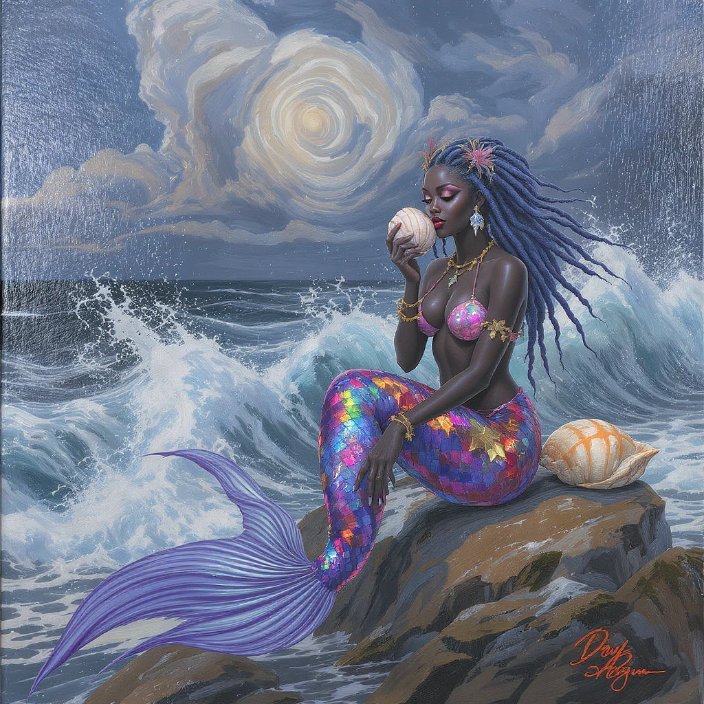 An airbrushed oil painting of a melanated mermaid with long, flowing blue locs adorned with aquatic-themed accessories. She sits gracefully on a rock by the ocean, holding a large seashell close to her face. Her shimmering tail features vibrant scales in shades of purple and red, reflecting the light. The turbulent ocean waves crash dramatically in the background under a dramatic sky filled with swirling clouds. The scene conveys a sense of serenity and wonder, with the mermaid's calm expression contrasting with the dynamic environment around her.