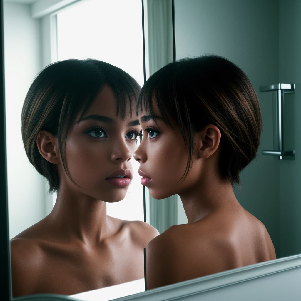 by Norman Ackroyd , colored_film_photography, depth of field, detailed , a photo of gorgeous a girl looks at her reflection in the mirror, perfect symmetry composition