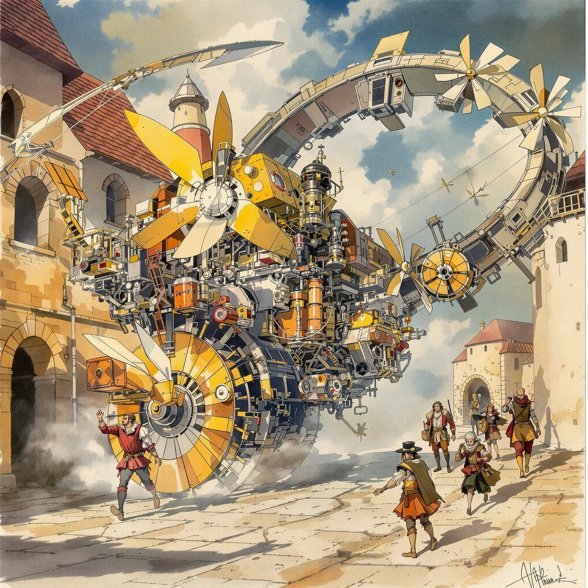 Medieval scene, detailed oil color pencils and wet-on-wet colored ink wash sketch of what life may be like in the future from a 16th century point of view, 21st century futuristic mechanical carriages, flying steam driven mechanical machines with oscillating propellers based on late 16th century England ideas and technology. retro futuristic steampunk technological elements steam powered.
