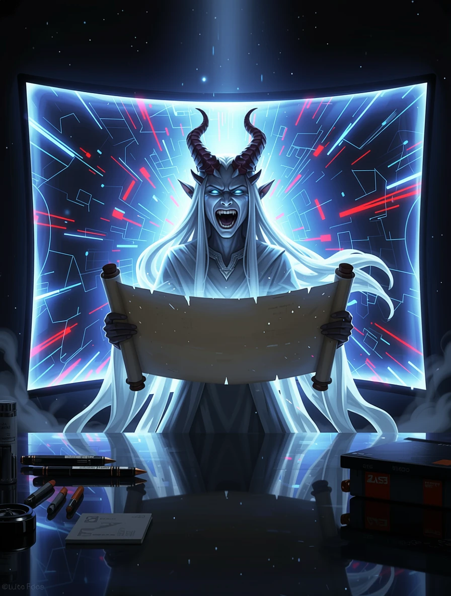 An avatar materialises on the table in front of Da5id, starting out ghostly and transparent, gradually becoming solid and three-dimensional. It’s a really trite effect; Hiro and Da5id are already laughing. The avatar is a daemon. holding a scroll in her hands. She’s unrolling it right in front of Da5id’s face, spreading it apart like a flat two-dimensional screen in front of his eyes. Da5id’s paralyzed face has taken on a bluish tinge as it reflects light coming out of the scroll. It is a living wall of light, like a flexible, flat-screened television set. Epic cinematic dramatic dystopian futuristic scene.