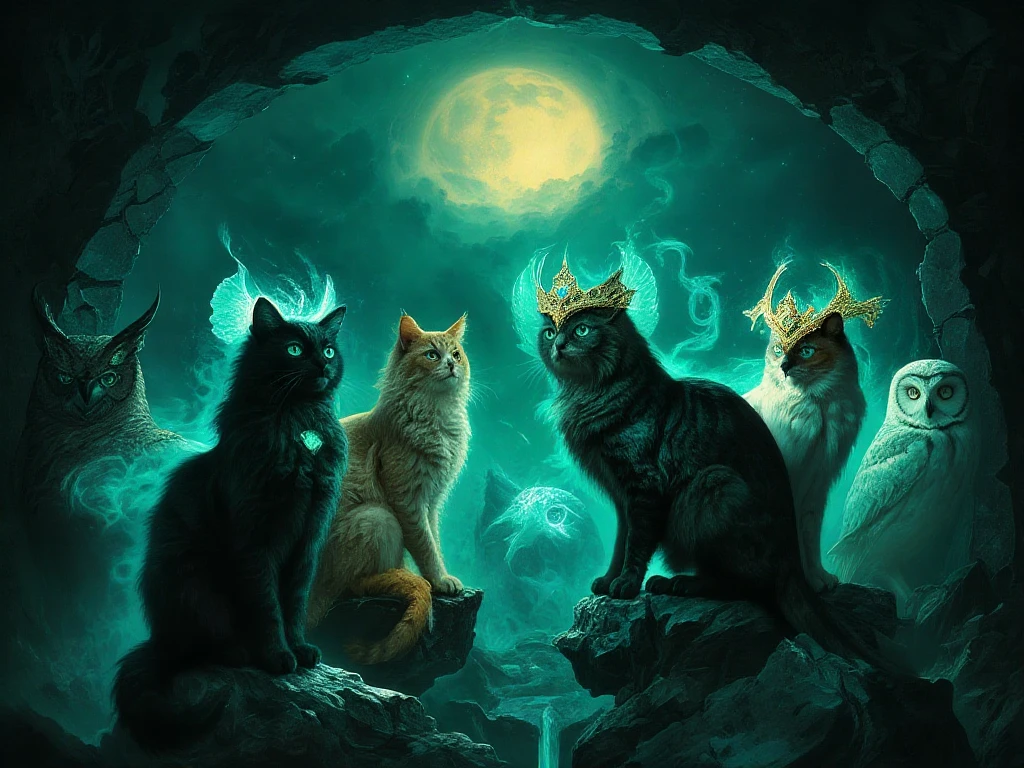 Moonlit gothic ruins, deep indigo fog — circle of sentinel cats **and owls** on cracked rune-monoliths::1. 4 cats: long-haired black, silver tabby, flame-point Siamese, ragdoll, calico, midnight pantherine owls: snowy owl, barn owl, great horned owl, soot-black screech owl, tawny owl each crowned with an ornate gold circlet set with tiny emerald shards, faint yellow halo behind crown::1. 5 every gaze—feline and avian—blazes emerald fire::1. 6 thin ghost-mist veil coils around the council::1. 3 swirling spectres and translucent tattered spirits held back by their shared divine aura::1. 4 broken archway frames star-swirl sky, ink-wash × painterly-anime fusion, low-angle cinematic depth