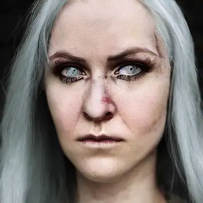 Cirilla Fiona Elen Riannon, twenty years old, lovely, scar on left cheek, Witcher 3: Wild Hunt, ashy hair, dark-green eyes, eyeshadows, bun hairstyle, slim body, not ugly, not old, not evil, hero, HDR , 8k, intricate detail, photorealistic, realistic light, wide angle, kinkfolk photography, A D architecture, HDR