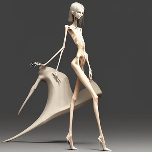 a needle-thin anorexic girl with skinny long legs and long skinny calves in high heels with long hooked claws, naked