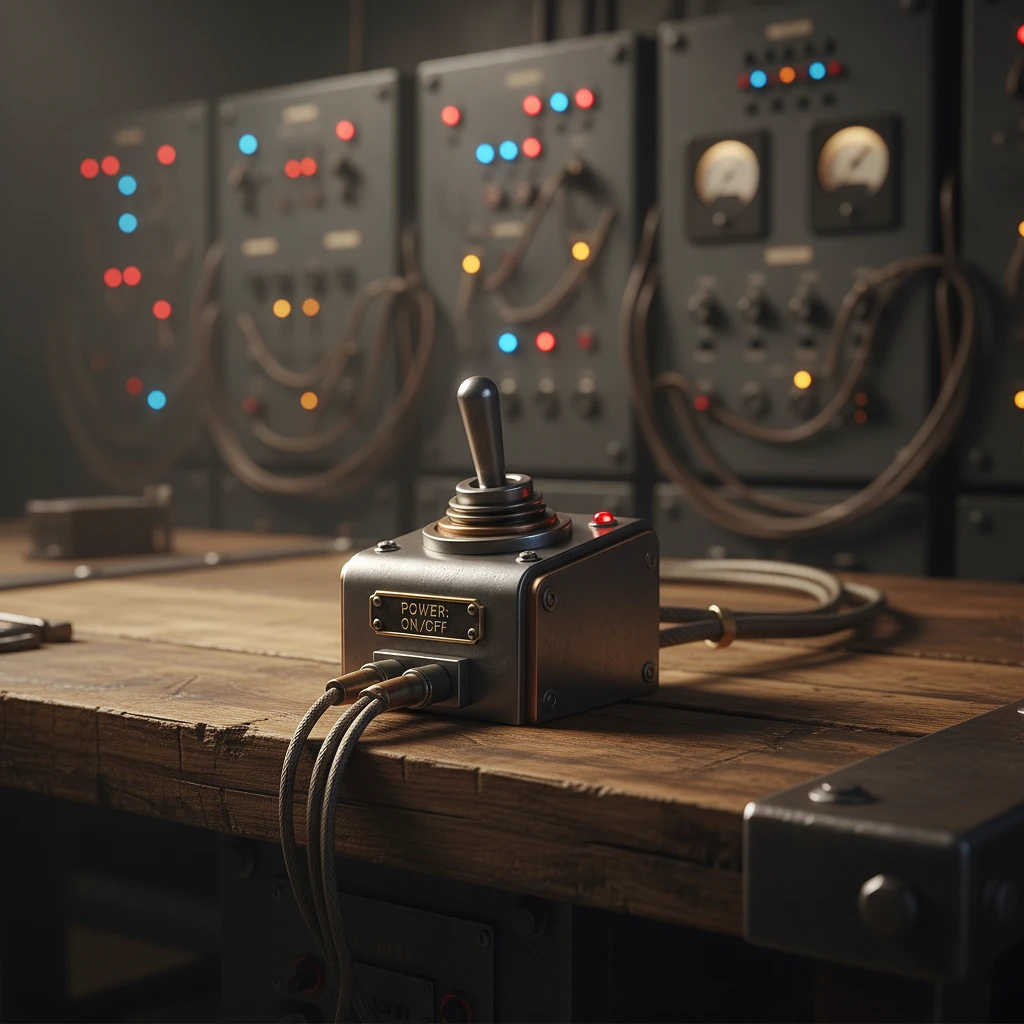 A cinematic ultra-realistic close-up of a heavy-duty metal toggle switch placed on a sturdy industrial workbench, with detailed textures of steel and wood. In the background, large industrial electrical control panels with illuminated indicators, cables, and switches. The scene is lit with dramatic cinematic lighting, creating soft shadows and metallic reflections on the toggle switch. Shot with a cinema camera, depth of field highlighting the switch in the foreground while keeping the control panels recognizable in the background. Ultra HD, photorealistic, 9:16 aspect ratio, perfect for Instagram Stories.