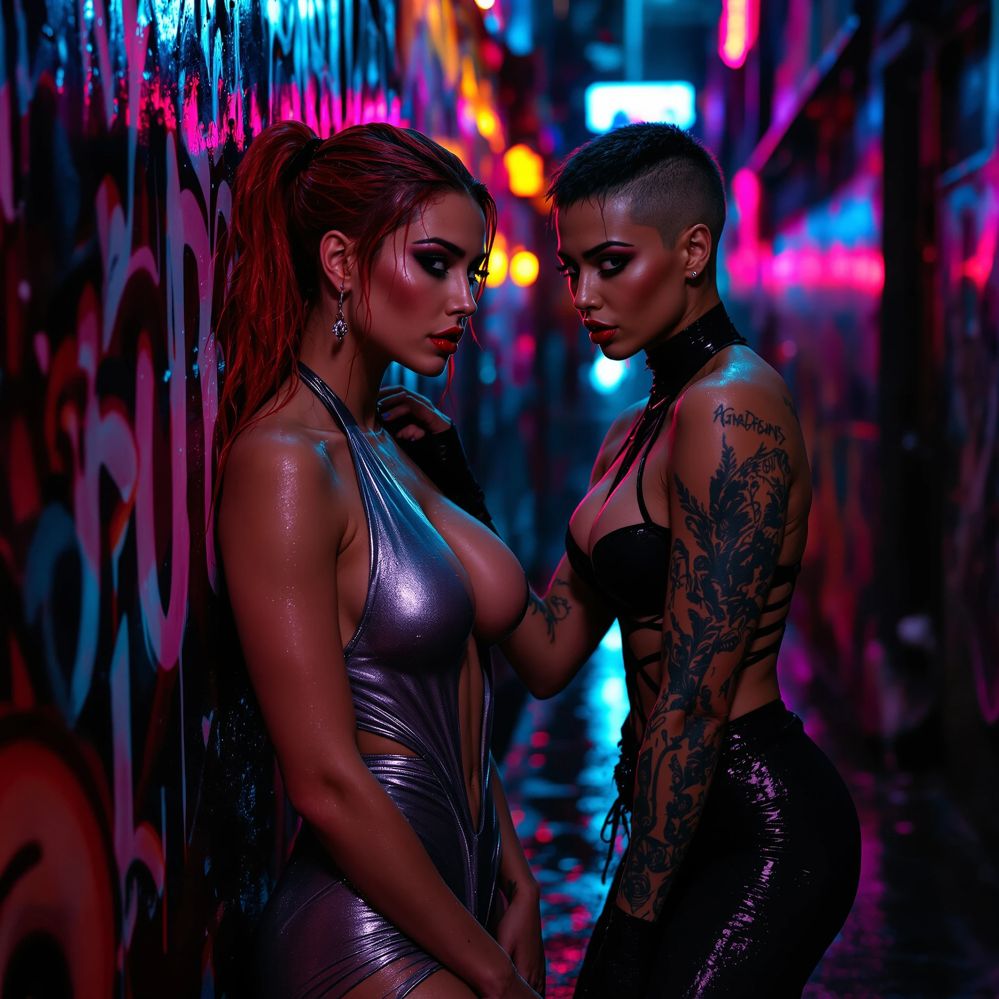 8K RAW cinematic scene of TWO athletic women in neon-soaked alley, Canon 5D Mark IV, 24mm f/1. 4, HDR wet reflections. The FIRST woman, lounge singer, slammed to graffiti wall, abs flexed, thighs taut. Outfit: silver metallic halter gown plunging wide, fabric stretched tight across implants, slit soaked in rain clinging to garters. Crimson hair plastered wet, glossy red lips parted, one hand clawing bartender’s collar. The SECOND woman, bartender, muscular and tattooed, pixie hair dripping wet. Outfit: black metallic harness bustier soaked and strained across her bust, leather pants clinging wetly. One hand gripping singer’s thigh high, garter taut, the other pressed flat to her ribs. Lips pressed against singer’s cheek, sweat and rain dripping. Atmosphere: hyper-real HDR noir, neon fire reflecting across metallic wet curves, cinematic RAW tension.