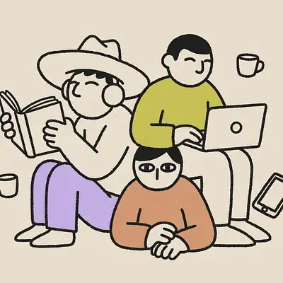 Playful abstract black-and-white illustration of a freelancer working at coffee shop , thick uneven black linework, rounded shapes, exaggerated pose, minimal details, clean whimsical style, hand-drawn feel, no color, white background.