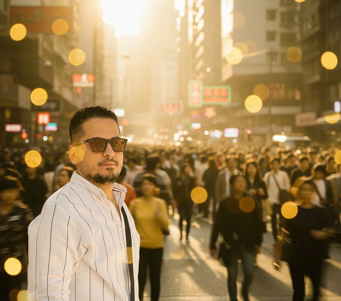 photography, candid shot, far range angle, capturing the urban vibe, single focused professional female model, staring to camera, surrounded by a blurred motion of yellow people walking past model, creating a sense of movement, model wearing black loose fit hoody, the main model is sharply in focus, contrasting with the transient figures around model, highlighting the theme of stillness amidst chaos, golden hour Hongkong main road backdrop, keep the attention on the motion effect, dramatic lights with bokeh and dust effect, photorealistic, rich detailed --ar 9:16 --style raw
