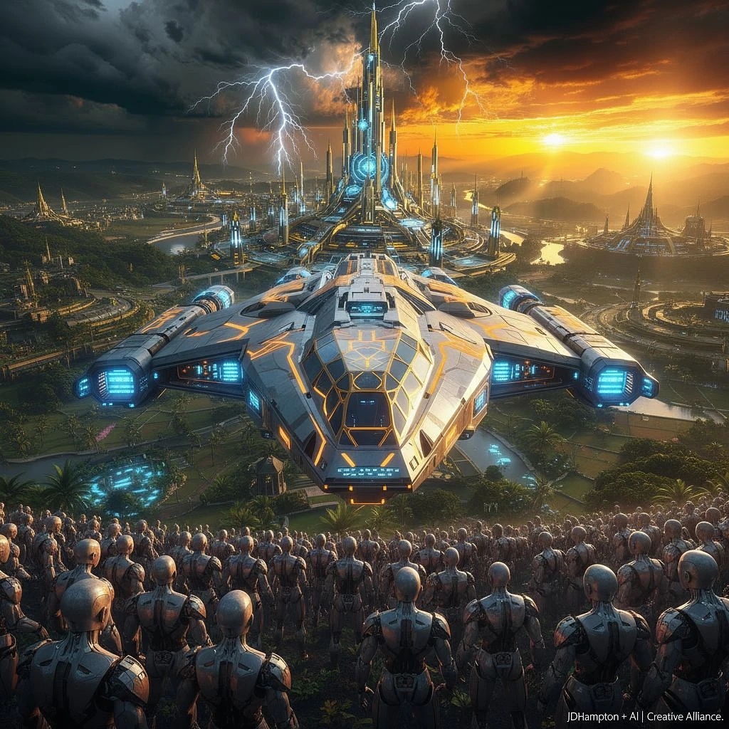 A vast golden Abydos Eygpt City in the back of rich thick lush beautiful jungle thives with rivers flowing smoothly and incredilby well designed with incredibly advance hyper realism, anciet agricultural farm lands Abydos Egypt on th right side of the river. A futuristic epic adventure, with wild life, tartaria building in the background with 1 ancient mythological flying spaceship hovering in the background that run on murcury rotational engine. Futuristic epic tribute tartaria, incredibly anciently advanced spaceship arrives to be inspected at the transolar line's arrival depo, as the ancient ones await patiently to board, Sci Fi, large orchre orange sleek designs and lines illuminate on the side of the spaceship. Creative digital art styles, hyper realism and brilliant lighting, wide angle, balanced composition and smooth, hard surface, neon light reflections, triadic colors, symmetry, hyper detailed, octane render, wide angle epic scifi futuristic. In the background a thick, beautiful lush jungle during sunrise, incredibly advanced spaceship arrives to be inspected at the transolar line's arrival depo case, located close to tartaria building, at the front of the spaceship it has an amazingly designed front window for the pilot which is super strong, the space has well design advanced wings with complex futuristic engine on the back of spaceship, the window is very strong. Sci Fi, large ochre orange designed markings on the side of spaceship of the hull, on top and on it wings. Creative digital art styles, symmetrical artwork. cinematic, hyper realism, combined with an effect of light bioluminiscent, wide angle, balanced composition and smooth, hard surface, neon light reflections, triadic colors, symmetry, hyper detailed, octane render, wide angle epic scifi futuristic, huge hyperspace spaceship in background, epic amazing real scifi environment, in style of digital art. Large space ships, intricate artwork masterpiece, golden ratio, intricate, epic, highly detailed, vibrant, production cinematic, ultra high quality model, Mysterious and you can clear see some people watching the spaceship arrive, with advanced cybernetic robot enhancements, capturing intricate mechanical details, the image showcases a seamless blend of human features and robotic components, emphasizing the complexity and sophistication of futuristic technology, cybernetics include a polished metallic finish with elements resembling futuristic muscles. Professional Mode. The **spaceship** features: - A **sleek, ultra-strong front pilot window** with a **geometric armored design** - **Large, intricately designed wings** with **ochre-orange markings** along the hull - **Complex futuristic engines** glowing with **neon reflections** - **spaceship arrives to be inspected at the transolar line's arrival depo, as the ancient ones await patiently to board - **Symmetrical, hyper-detailed** hard-surface design with **triadic color accents** **Art Style & Technical Details:** - **Cinematic hyper-realism** with **Unreal Engine 5 RTX shaders** - **Octane render, ultra-HD textures**, and **golden ratio composition** - **Wide-angle shot**, balanced symmetry, **dynamic lighting** (sunrise + bioluminescence) - **Metallic silver, ochre-orange, and vibrant neon** color scheme - **Professional digital artwork**, resembling a **sci-fi movie poster** - **Mysterious, immersive atmosphere** with **highly detailed mechanical elements** Scheme is subdued with metallic shades of silver, orange ochre, and vibrant -like fibers, reflecting a realistic and somewhat somber tone appropriate for the futuristic theme, the rendering is hyper-realistic, focus on texture and lighting that highlights the reflective properties of the materials and the subtle human skin tones, RTX shader, unreal engine 5, detailing, golden ochre ratio, movie poster, golden ratio, intricate, epic, highly detailed, vibrant, production cinematic, ultra high quality model. Signature: JDHampton + AI | Creative Alliance. Mysterious Sci-Fi Futurism with Robot AI --ar 9:16 --style raw --v 6. 1