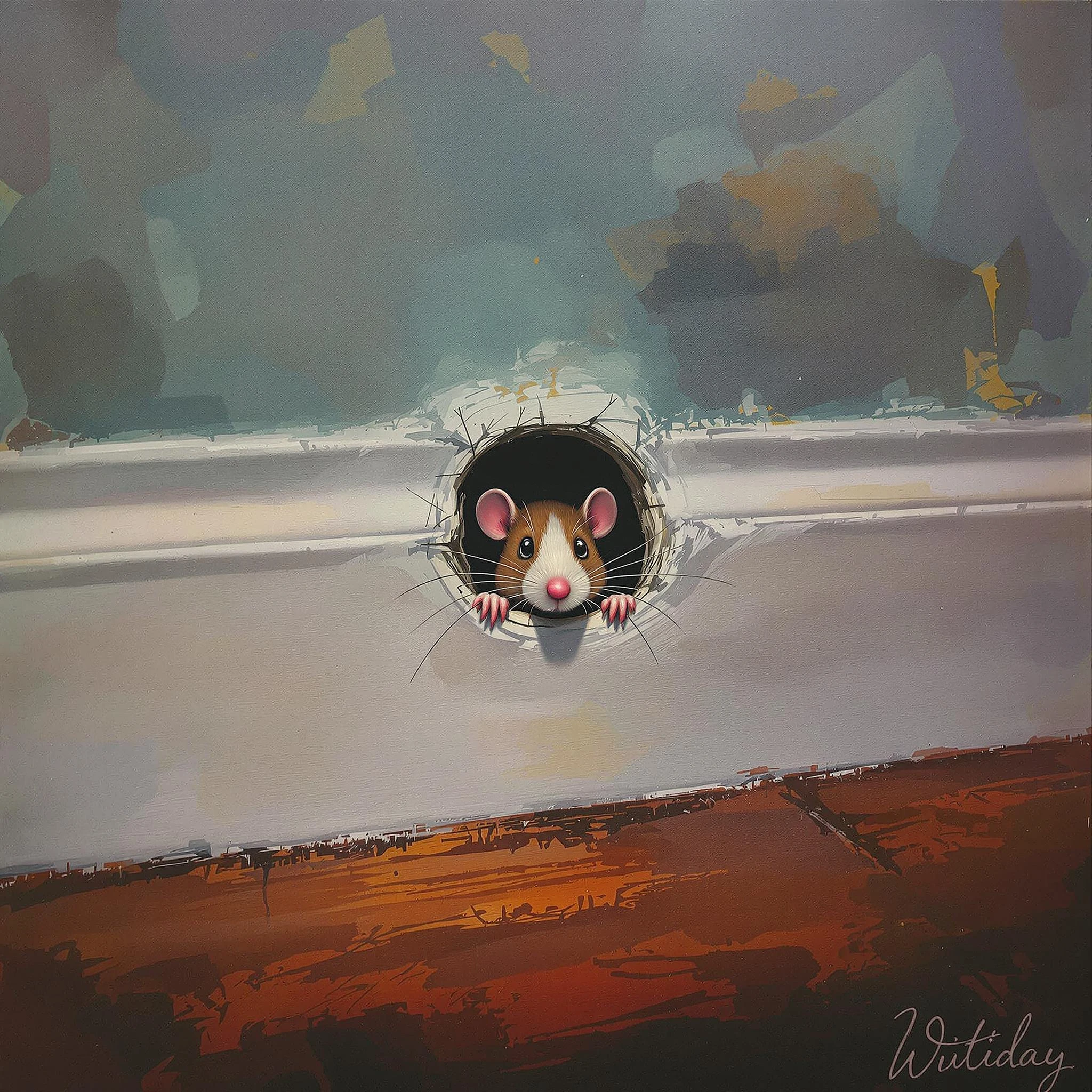 "An illusion of a mouse hole in the baseboard with a painted mouse peeking out"